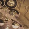 Бархатные кружечки соединненые между собой на шелковой основе. Внутри кругов ткань вырезана.Очень оригинальная дизайнерская ткань высочайшего качества.