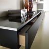 Композиция для гостиной из коллекции NESTOS от Mercantini состоит из разнообразных навесных ящиков, полок и подставки для телевизора. Комплект полностью покрыт лаком разных оттенков - от светло-серого на фасадах верхних ящиков до темно-землистого на нижних. Асимметрично расположенные ручки, из хромированного металла, идеально дополняют комплект.