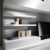 Минимастичный комплект для гостиной Mercantini на основании, покрытом белым лаком. Задняя стенка выполнена из древесины в матовом светло-сером цвете. Подвесные ящики и открытые полки отделаны в тон основания комплекта. В центре модели предусмотрено место для телевизора.