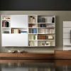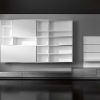 Эта композиция для гостиных состоит из элементов, не соединенных между собой. Низкая полка в отделке под орех служит основанием комплекта. Подвесные элементы белого матового цвета. Отдельная полка для телевизора декорирована горизонтальными металлическим профилем. Створки закрытых ящиков выполнены из непрозрачного белого стекла.
