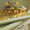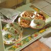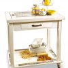 Сервировочный столик на колесиках выполнен из массива дерева в стиле кантри. При изготовлении столика используется окраска древесины и искусственное состаривание. Изделие оснащено столешницей, основная часть которой превращается в поднос, выдвижным ящиком и открытой полкой. Столешница столика и его полка декорированы керамическими плитками. Компания предлагает различные варианты обработки модели.