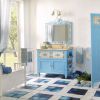 Деревянный комплект для ванной комнаты с керамическими плитами состоит из столика под умывальник, трехстворчатой ширмы, двухместной лавки-сундука и зеркала. Столик оборудован мраморной столешницой с вырезом для круглой раковины, двумя дверцами и маленькими боковыми полочками. Над столиком расположено зеркало с фигурной рамой и керамическим декором. Лавкам имеет подлокотники и вместительную нишу для полотенец. Вся мебель обработана с применением окраски и искусственного состаривания.