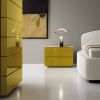 Комплект для спальных комнат из современной коллекции VERA от Mercantini. В этом наборе представлена кровать PEGASUS с подкроватным ящиком. Выступающий каркас кровати обит материей и покрыт искусственной кожей. Глянцевые тумбы и высокий комод горчичного цвета из каталога производителя. Дополняет композицию зеркало в матовой раме.