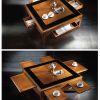 Кофейный столик MERLINO, выполнен в классическом стиле. Имея квадратную форму, он имеет короткие ножки и оборудован шестью выдвижными полочками и четырьмя выдвижными ящиками. Изготовлен столик из массива дерева. Отделка столешницы: деревянные вставки в черном лакированном цвете