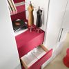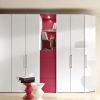 Угловой платяной шкаф от Mercantini с раздвижными и распашными створками. Узкие двери в глянцевом белом лаке дополнены ярким встроенным модулем с открытыми полками из стекла и закрытыми выдвижными ящиками. Боковые сдвижные створки этой модели изготовлены из дымчатого стекла в белой раме из алюминия.