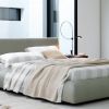 В наборе представлена кровать с высоким изголовьем и подиумом. Каркас кровати выполнен из древесины. Для обивки и декора используется текстиль из коллекции фабрики. С одной стороны набор дополняет прикроватная тумбочка из древесины под грецкий орех, с другой - низкая этажерка для книг.