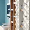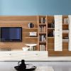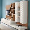 Модульная стенка имеет множество небольших открытых полочек, расположенных в средней части стенки. Правая сторона оборудована четырьмя навесными шкафчиками с открывающимися дверками. В левой нижней части расположен модуль, состоящий из тумбочки с двумя параллельными выдвигающимися ящиками. Широкое пространство над тумбочками может быть заполнено большим цифровым экраном. Оригинальность стенке придает дизайн, заключающийся в сочетании каркаса, изготовленного из натурального ореха и шкафчиков, покрытых белой лакировкой. Основанием стенки является модуль сатинированного стального плинтуса.