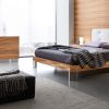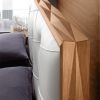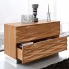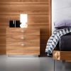Комплект мебели для спальной комнаты из натурального ореха создает уют и комфорт для отдыха и сна. Каркас кровати и панели ящиков комода и прикроватной тумбочки украшены трехмерным геометрическим узором, создающим игру света и отражений. Изголовье кровати выполнено из белой кожи с узором в виде ромбовидной решетки. Модель установлена на сатинированные стальные ножки. Прикроватная тумбочка, состоящая из одного большого и двух маленьких ящиков, так же как и комод установлена на стальной плинтус. Кроме того, комод имеет три выдвижных ящика различной высоты.