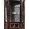 Необычный овальный обеденный стол на двух массивных ножках и буфет полукруглой формы из коллекции ART DECO' выполнены на высочайшем уровне с применением ручной резьбы по дереву и богато отделаны инкрустацией. Столешница стола оборудована симметричными встроенными вращающимися столешницами. Витрина оборудована двумя стеклянными полками и расписанной цветами задней стенкой, которые прикрывают стеклянные дверцы. Стулья изготовлены из ценной древесной породы эбенового дерева, сидения и спинки которых обиты высококачественным текстилем. Также они украшены резными элементами, покрытые серебром.