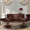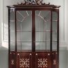 Элегантный гарнитур для столовой комнаты коллекции KING включает в себя обеденный овальной формы стол, стулья с высокой спинкой, буфет и витрину. Основным материалом для изготовления данной мебели является массив дерева. Для отделки изделий использовались сложные резные элементы, инкрустация и серебро. Столешница стола поддерживается двумя фигурными массивными ножками. Створки и полки витрины выполнены из стекла, верх модели украшен резной виньеткой, нижняя часть оборудована четырьмя закрытыми дверками. Боковые части витрины и буфета имеют полукруглую вогнутую форму. Буфет сочетает в себе как выдвижные ящики, так и распашные дверцы.