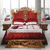 Красная обивка и позолоченные резные элементы придают этой спальне роскошь и шикарное убранство. Изумительное изголовье двуспальной кровати зрительно поделено на несколько частей, нижняя из которых выполнена техникой капитоне, а верхняя поделена на широкие полосы. Средину изголовья и его периметр украшает сложная резная композиция. С аналогичным дизайном выполнена скамья, которая имеет резную основу, покрытую позолотой, и мягкое сиденье, обитое техникой капитоне. Прикроватные фигурные тумбочки с тремя выдвижными ящиками и инкрустированными столешницами прекрасно дополняют композицию. Возможны несколько фирменных вариантов обработки мебели.