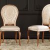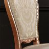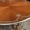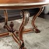 Круглый стол и удачно подобраны к нему стулья (с подлокотниками или без них) выполнены в классическом стиле из массива дерева. Ножки у стола имеют S-образную форму и соединены между собой резной крестовиной с звериными лапами. Столешницу и резные элементы ножек украшает серебряная роспись. Обивка спинки и сиденья стульев представлена из широкого ассортимента компании. Также возможны другие варианты отделки изделий.