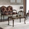 Композиция для гостиной сочетает в себе двухместный диван, маленький центральный столик, кресло и боковые круглые столики. Все мебель выполнена из древесины бука в черной отделке с нанесением флорентийского золота на резные элементы. Спинка и сиденье дивана и кресла оббиты тканью с элегантными узорами из ассортимента компании. Подлокотники моделей деревянные.