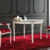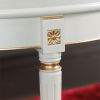 Круглый раздвижной стол и удачно подобраны к нему стулья (с подлокотниками или без них) выполнены из массива дерева в античной белой отделке. Характерные резные узоры и нанесение на отдельные элементы состаренного золота передают атмосферу античной эпохи. Обивка стульев представлена из широкого ассортимента компании.