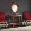 В композицию входят стул коллекции Royale, консоль и зеркало Regina. Каркас стульев изготовлен из бука, покрытого золотой фольгой. Обивка спинок и сидений модели представлена из широкого ассортимента компании. Консоль имеет полукруглую столешницу и открытую фигурную нижнюю полку, которые соединены между собой четырьмя резными колонами. Овальное настенное зеркало обрамлено изысканной стилизованной и декорированной рамой с четкими линиями узоров, покрытой золотой фольгой.