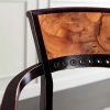 Мебель изготовлена из массива бука с лакированной темной отделкой. Круглый стол имеет одну массивную фигурную ножку, выполненную в двух цветах. Стулья с подлокотниками имеют мягкое оббитое кожей сидение с окантовкой. Маленькая спинка стульев расположена над линией подлокотников, но это никак не сказывается на их удобстве. Компания также предоставляет другие варианты отделки и обивки представленных изделий.