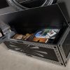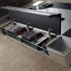 Прямоугольный столик и комод с откидной столешницей выполнены в чёрно-серебристом цвете и декорированы фигурными элементами. Боковые части столика скрывают под собой полки и ниши для CD/DVD-дисков, а в центральной части расположен мини-бар. Гармонично дополняет мебельную композицию настенное круглое зеркало контрастного цвета.