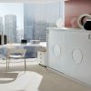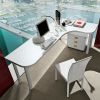 Оригинальная мебель для работы в офисе выполнена в белой лакировке и состоит из углового правостороннего стола, тумбочки с тремя выдвижными ящиками, удобного стула с низкой спинкой и невысокого шкафа-купе для верхней одежды. Столешница стола поддерживается пятью окрашенными стальными ножками, которые способны регулироваться по высоте в диапазоне 10 сантиметров. Стол достаточно широкий и вместительный, чтобы можно было работать не только с бумагами, но и использовать ноутбук или компьютер. Мобильная тумбочка на колёсиках и с тремя выдвижными ящиками позволит вам хранить ценные бумаги и документацию. Платяной шкаф с дверками-купе достаточно вместителен для верхней одежды, а его высота даст возможность использовать верхнюю поверхность как дополнительное место для хранения папок, рабочих бумаг или же красивых предметов интерьера. Доступным вариантом оформления представленной мебели (кроме стула) является фанеровка изделий красным деревом.