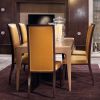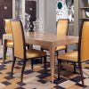 Изысканный мебельный гарнитур для столовой состоит из раздвижного прямоугольного стола и стульев с высокой спинкой. Стол выполнен из древесины вишни и имеет возможность удлиняться с помощью двух полуметровых вставок. Поверхность изделия сияет и искрится благодаря тщательной полировке его поверхности. Каркас стульев изготовлен из массива бука. Обивка мягкого сидения и спинки выполнена роскошной тканью, хотя есть возможность обтянуть их кожей. Для каждого изделия компания предлагает множество вариаций отделки и обработки поверхности, от чего и формируется цена уникального предмета мебели.
