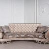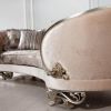 Большой, уникальный, привлекательный на вид и оригинальный по цвету мягкий диван, внесет шик в ваше пространство. Не высокая спинка плавно переходящая в подлокотники украшена клепочным декором. Обивка светло бежевого тона прекрасно гармонирует с независимыми подушками сиденья в чуть темнее оттенок того же цвета. Причем подушки сиденья обиты тканью с узором. Подлокотники и ножки дивана обильно резные, как и ножки стеклянных журнальных столиков со стеклянными полочками. Каркас дивана и столиков выполнен из металла. Мягкий пуф в светлой обивке с металлическим ободом дополнит эту шикарную коллекцию.