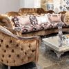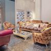 Богатая, интересного дизайна и расцветки мягкая мебель, состоящая из: большого дивана и кресел, достойно займет место в Вашей гостиной. Диван, по форме напоминающий трон украшен клепочным декором. Подлокотники изогнуты и высокие, как и спинка дивана. Обивка дивана и кресел одинакова и представлена в бежевом цвете, мягкого бархата. Спинка кресел плавно перетекает в подлокотники и обрамлена в дерево, как и резная спинка дивана. Подушки сиденья независимы, как у кресел, так и у дивана и обиты цветастой материей, что делает эту мебель интересной. Низкий кофейный столик на резных ножках, с зеркальной столешницей гармонично дополнит эту коллекцию.