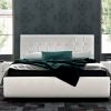 Кровать Prestige в сочетании с лево- и правосторонней прикроватными тумбочками, а также комодом с тремя выдвижными ящиками создают красивую и уютную спальню, а декоративные элементы из стразов Swarovski придают ей дополнительное сияние и роскошь. Двуспальная кровать без изножья имеет деревянный каркас, облицованный экологической, натуральной кожей или kaiman. Высокое изголовье модели украшено квадратной стяжкой с кристаллами Swarovski. Как вариант конфигурации модели изготовитель предлагает под ортопедической сеткой, подымающейся с помощью механизма с газовыми амортизаторами, разместить контейнер для белья. Вместо стразов Swarovski панели тумбочек и комода может украшать облицованные вставки из экокожи или kaiman с цветами по образцам. Обивка и облицовка мебели исполняется в любом цвете из каталога производителя.