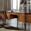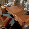 Письменный стол с кожаной рабочей панелью и кожаное офисное кресло имеют качественное деревянное основание и профессиональную отделку. Стол поставлен на четыре ножки-кабриоли, изгиб которых подчёркнут волнообразной нижней линией модели. Просторная столешница позволяет разместить на ней не только рабочие бумаги, но и настольную лампу и рамки с фотографиями близких людей. Выдвижные ящики в верхней части и по обе стороны от сидения выполнены в едином стиле, но имеют разную глубину или длину. Вращающиеся кожаное кресло имеет стёжку-капитоне на своей спинке, регулируемую высоту посадки и пятилучевое основание на колёсиках.