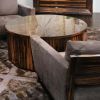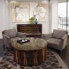 Изысканный набор мебели для гостиной в натуральных оттенках дерева и серого тона обивки это воплощение удобства и красоты. Гармоничный, неповторимый дизайн массивного стола станет декором интерьера. Стол округлый в виде большого сруба дерева в нескольких его оттенках. Комод четкой прямоугольной формы с двумя дверцами сделан из ценной породы дерева и представлен в такой же расцветке, что и стол. Мягкое кресло с низкой деревянной спинкой дополнено мягкими подушками. Кресло с подлокотниками простой формы обито в мягкую ткань серо-лилового оттенка. Вся мебель покрыта лаком, что придает ей лоск. Коллекция мебели выполнена в интересном дизайнерском решении.