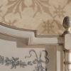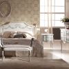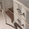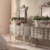 Представленный комплект мебели для спальни состоит из кровати с деревянным изголовьем, банкетки, прикроватных тумбочек и комодов с красивыми ручками на выдвижных ящиках. Фигурное изголовье двуспальной кровати декорировано гирляндовым рисунком, элементы которого нанесены на выдвижные ящики комодов. Прикроватные тумбочки, комоды и банкетка установлены на высокие изящно изогнутые ножки.