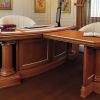 Письменный стол изготовлен из массива дерева. Оснащен тремя выдвижными ящиками и местом для системного блока. Встроенные колонны на фасаде стола, особенно придает шарм этому дизайну. Также стол включает в себя приставку для приема посетителей.
