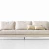 Шикарный трехместный диван, итальянского производства, выполнен в интересном дизайнерском решении в современном стиле. Диван с каркасом из металла обит в дорогую, износостойкую ткань, нежного кремового цвета. Диван выполнен без подлокотников, с боковыми низкими подушками, которые создают видимость мягких подлокотников. Вместо спинки диван имеет дополнительные мягкие подушки, простой прямоугольной формы. Опирается диван на металлические ножки простой формы.