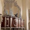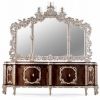 Буфет выполнен в строгом классическом стиле, окрашен в темные тома, а его фасад украшен орнаментами резьбы ручной работы. Он размещается на тонких изысканных ножках, которые служат ему надежной опорой. Над комодом будет шикарно смотреться огромное декоративное зеркало, заключенное в изысканную раму.