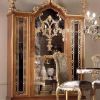Витрина выполнена из светлых пород ценного дерева. Весь ее корпус украшен декоративной резьбой и покрыт слоем блестящего лака. Фасад изделия преимущественно стеклянный, из дерева выполнены только рамы дверок, и позволяет легко просматривать содержимое полочек. Сами полочки смогут легко разместить даже объемные вещи.