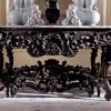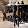 Стол отличается уникальным дизайнерским решением, которое ярко выразилось в изящной форме столешницы. Так же невозможно оторвать глаз от декоративных ножек стола, выполненных из темного дерева ценной породы и богато украшенных росписью ручной резьбы.