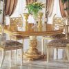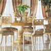 Изысканный круглый стол и элегантные мягкие стулья для вашей гостиной комнаты из итальянской коллекции мебели Temptations. Стол выполнен из светлых пород ценного дерева, которому оставили его природный оттенок. Спинки и задние ножки стульев немного изогнуты, подушки для сидения обтянуты шикарной тканью. Все смотреться дорого и со вкусом.
