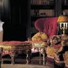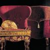 Каркас кресла сделан из ценного дерева и располагается на четырех невысоких ножках украшенных декоративной резьбой ручной работы. Спинка кресла немного расширяется к верху, а подлокотники практически отсутствуют. Для его обшивки использовалась дорогая ткань, местами украшенная каретной стяжкой.