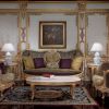Гарнитур для гостиной LENA, состоящий из трехместной софы в обивке из ткани, двух кресел, кофейного столика овальной формы и двух круглых столиков. Вся композиция выполнена в роскошной цветовой гамме. Общая картина вызывает ощущение, что вы попали в настоящий дворец.
