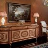 Модель отличается изысканной элегантностью, с несколькими видами дерева маркетри и деталями из латуни и перламутра. Из массива дерева, ручная резьба с золотой фольгой и французской патиной.