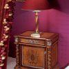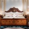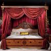 В центре композиции роскошная двуспальная кровать с балдахином. Шторы ручной работы из драгоценного шелка украшены элегантным плетением. По бокам стоят две прикроватные тумбочки. Рядом туалетный столик с большим круглым зеркалом.