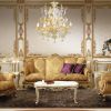 Мебель декорирована сусальным золотом и обита дамасским шелком, в то время как маленький мраморный столик завершает композицию.