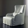 Кресло Liu в обивке из текстиля, внешние стороны в обивке из натуральной кожи. Спинка высокая, а сглаженные углы подлокотников создают еще более мягкий образ. Кресло создает идеальной пространство для отдыха и уюта. В комплект возможно приобретение подушечек из кожи либо текстиля.