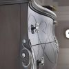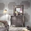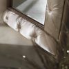 Мебель для спальной комнаты в классическом стиле. В центре расположилась большая двуспальная кровать с обитым изголовьем капитоне и резными ножками. Поблизости стоит комод с четырьмя ящиками. Над комодом висит аккуратное квадратное зеркало, рама которого обита плиссе. В спальне есть все необходимое и в то же время нет ничего лишнего.