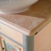 Удобная и изысканная мебель для ванной в классическом стиле .Основной блок имеет нежную светлую расцветку, ящики выдвижные.Столешница каменная, над ней 2 умывальника из фарфора. В комплекте зеркало и подсветка. Мебель покрыта росписсю ручной работы