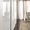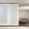 Шкаф с раздвижными створками. Створки выполнены из дуба, покрытого белым либо серым матовым лаком. Фронтальная панель исполнена из стеклянного матового белого стекла, ручка выполнена из никеля. Каркас и внутреннее оснащение соответственно из белого либо серого материала. В центре створок вставки в виде зеркальных поверхностей, что делает шкаф еще более удобным.