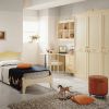 Мебельная композиция Prop 31 для спален от производителя Pentamobili. Включает шкаф с тремя дверками, односпальную кровать с цветными вставками, письменный стол, навесные полки и пуф. В композиции использованы бледно-желтые цвета.