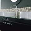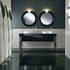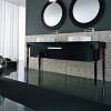 Гарнитур для ванной комнаты из коллекции Deco включает в себя консоль с умывальником, шкаф с откидными ящиками и зеркало в круглой раме. Мебель исполнена из ценных пород дерева, покрытых черным глянцевым лаком. В данной модели консоли предусмотрено две раковины. Ножки мебели резные. Раковины круглые с нанесенным орнаментов по внешней стороне. Мебель исполнена в современном стиле.