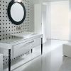 Гарнитур для ванной комнаты из коллекции Deco включает в себя консоль с умывальником, шкаф с откидными ящиками и зеркало в круглой раме. Мебель исполнена из ценных пород дерева, покрытых белым глянцевым лаком. В данной модели консоли предусмотрено одна раковина, прямоугольной формы в форме листа с загнутыми углами. Ножки мебели резные и идут в контраст основному цвету мебели и покрыты черным глянцевым лаком. Мебель исполнена в современном стиле.