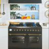 Кухонный блок серии "PROFESSIONAL NOSTALGIE" выполнен из высококачественной нержавеющей стали. Модель очень широкая благодаря двум независимым духовкам. Варочная поверхность может комплектоватся шестью конфорками или четирьмя конфорками и поверхностью для гриля. Возможны варианти отделки в бордовом, графитовом, молочно-белом цвете а также вариант из нержавеющей стали.