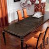 Прекрасная и изысканная мебель для столовой исполнена в классическом стиле. Модели имеют темную расцветку и покрыты блестящим глянцевым лаком. Столик выполнен в раздвижном варианте, на столешнице присутсвует геометрический узор. Обивка стульев кожаная, оранжевая, на выбор из ассортимента компании производителя. Отдельные элементы моделей украшени резьбой.