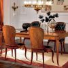 Изысканная мебель для столовой в классическом стиле из коллекции Venezia будет украшением для дома. В набор входят раздвижной стол и мягкие стулья. Стол выполнен из натурального дерева и покрыт гладким блестящим лаком, столешница украшена узором. Стулья имеют черную кожаную обивку на сидении и на спинке.
